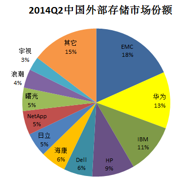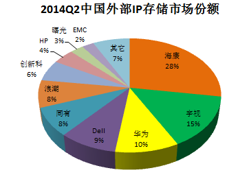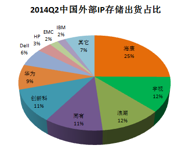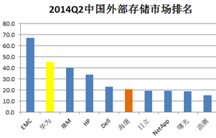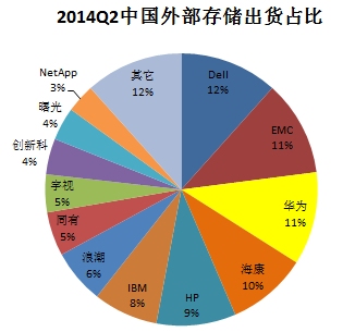 从出货量角度分析,2014年第二季度前5名中国产厂商除华为以11%排名第三外,海康威视以10%超越HP、IBM位列第四位,一、二、五位被DELL、EMC、HP占据,IBM跌出前5。国产厂商增长强劲。