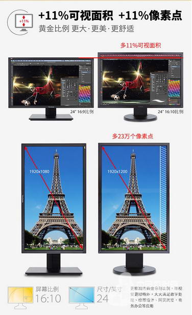 如今的消费者对显示屏可谓越来越挑剔,不仅要求其功能丰富一机多用,同时色彩呈现、视觉体验、健康环保等一个都不能少,而优派VG2438sm在上市前便充分考虑了这些因素,本次火爆大卖便是最好的印证。优派VG2438sm拥有经典的16:10黄金比例宽屏显示,用户的视野可以更加开阔。相比较16:9的显示屏,VG2438sm多了11%的可视面积以及23万个像素点,而且更接近美学的黄金比例,所以呈现的画面更符合人体视觉审美,更能满足人体视觉舒适性,即使长时间观看也不会出现疲劳,可以为消费者带来最完美的视觉体验。这一黄金分割比例能极好满足大量数字处理、绘图设计和网页浏览工作的需要,因此十分适合商业使用。