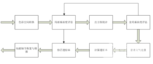 目前通过增强的方式(浅透雾)来进行透雾处理典型的方法包括:直方图均衡化、滤波变换方法和基于模糊逻辑的方法。直方图均衡化方法,其中全局化方法运算量小但对细节的增强不够;局部均衡方法效果较好,但可能引入块状效应、计算量大、噪声被放大及算法效果不易控制的问题。滤波变换的透雾算法,通过局部处理能获得相对较好的处理结果,但它们的计算量巨大、资源消耗多、不适于实时性要求较高的设备。已知的基于模糊逻辑的方法透雾的效果不够理想。