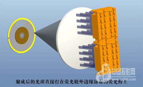 如果既要确保高亮度又要长寿命,可以采用十倍于转盘型荧光体照射强度的激光照射在滚筒型荧光体上,这样滚筒型激光荧光光源可以实现转盘型激光荧光光源十倍的亮度输出与十倍的寿命。