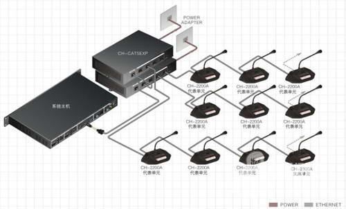 该系统采用一台会议主机,3个主席单元加65个代表单元通过网线手拉手连接起来,会议主机CH-2000位于中心机房,会议主席/代表单元CH-M2100A/2200A摆放在桌面,方便简单。单元为电容触摸按键,无机械按键声,防水耐用,轻点指尖,随即开启!