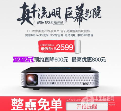 爆款机型一:超千流明新品酷乐视S3,原价3399元,预约抵扣200元、下单立减400元、前3分钟付款还能返现200元,最高直降800元,到手价即为残暴的2599元!!!3分钟后购机赠价值188元的原装3D眼镜。当然如果你够幸运,在12月12日11:00-19:00每个整点前5名付款成功,还能获赠价值479元100寸16:10电动幕布,更更惊喜的是,如果你是00:00、10:00、20:00点整付款成功的第一名用户,还将获得免单购机大奖。另外,酷乐视S3还开启换购服务,酷乐视Q6系列换购+1999元,酷乐视X6C系列换购+1599元,酷乐视X6系列换购+999元,即可换购;