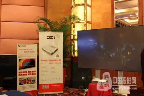 在高峰论坛现场,菲斯特携手DET,F光学屏幕——激光电视屏幕搭配DET-C6激光电视向到会观众展示了激光投影炫丽多彩、无与伦比的魅力。由于菲斯特F光学屏幕具有独有多层光学结构功能层,可以有效吸收环境光,呈现高对比度图像,在明室环境下观看效果令人赞叹!在现场也吸引了众多业内人士的围观。