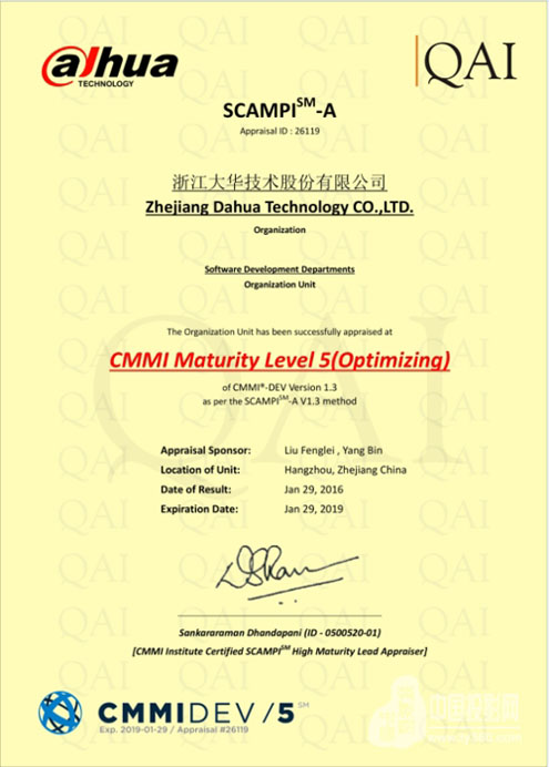 近日,根据美国CMMI 软件研究院通知,大华股份正式通过软件CMMI 5级认证,荣获国际软件领域最严格认证机构颁发的 CMMI DEV1.3 ML5证书。大华股份至此奠定软件开发全球领先地位,并树立全球安防行业软件开发领域标杆。