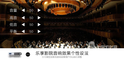 新款美高G10微型投影机用户可以自己随心调整音响效果,用户根据播放内容可以调整声音的大小和声音的平衡。