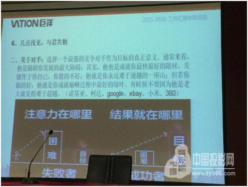 2016年3月21日-23日,VATION巨洋2015年度总结2016年度计划大会在风景秀丽的大明湖畔圆满落幕。会上VATION巨洋总裁魏磊先生对2015年工作做了总结陈词,部署了2016年公司营销团队的整体战略目标。各营销平台在会上积极分享了各自区域的可喜成果和宝贵经验,营销精英们对2016年市场看好,整装待发,势头正劲 !