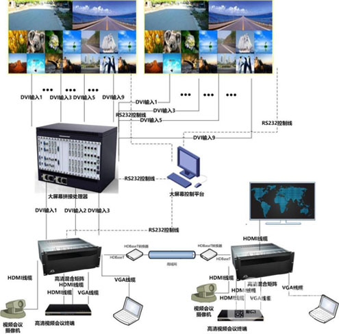 视频输入部分预留至少6路HDMI信号介入3套高清视频会议系统,同时,预留至少5个小会议室5路HDBaseT高清DVI接口,预留至少2路VGA接口为介入会议大厅内的电脑信号提供接口,预留至少2路高清视频会议摄像机HDMI信号。