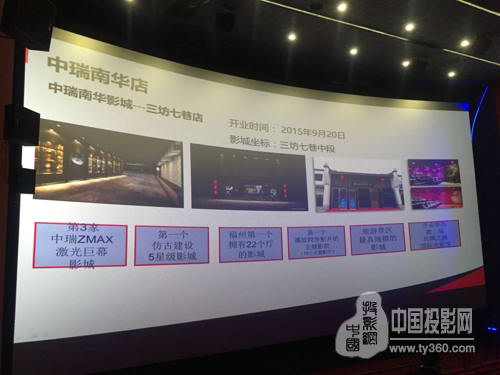 3月24日,在中瑞万星国际影城一场技术为主的影院角逐正在进行。作为福建省最大巨幕影厅,中瑞万星国际影城(省体店)投资额达3000万人民币,总建筑面积6500多平方米,设有9个一流的专业影厅,共可容纳1420名观观众。2015年全年票房达到3800多万元。