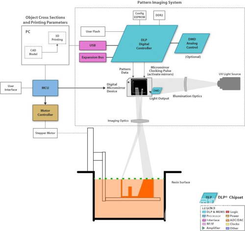 当SLA技术与DLP技术结合时,DMD会由UV光源点亮。然后DMD的像素被分别处理,图像被投影到树脂层,从而产生一系列截面,这些截面可组成3D物体。采用DLP技术能够带来多种优势,比如能用光学技术使来自DMD的各个像素成像,而不是让光源直接在树脂上成像,这样可优化分辨率和特征尺寸。【图像1】