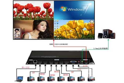 支持音、视频同步切换功能。其中HDMI和DP内嵌音频信号,VGA外部绑定Audio信号输入。在放大某窗口视频信号全屏显示时音频信号可跟随切换,或者四画面分割模式下独立切换音频信号。