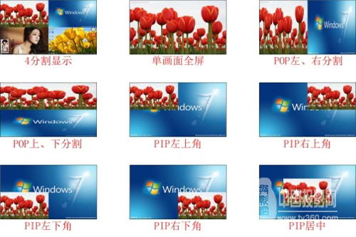 除了四画面分割显示和单幅画面全显示显示外,还可支持多种不同的显示模式,以下为产品所有显示模式: