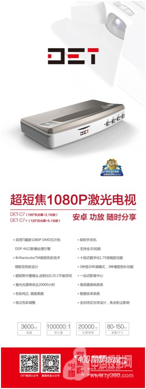 DET德浩展位的家庭影院由最新的激光产品DET-C7组成,搭配了100寸大屏抗光幕、2.1声道音响、高清前置摄像头等,供现场参观者体验了一番随录随播的功能。DET-C7配备了内反射式超短焦镜头、1080P高清分辨率,实现55厘米超短距离投影100寸大画面,最大程度的节约了客厅面积。此外,DET-C7还内建安卓系统,支持个性化APP应用,内置无线WIFI,全力打造一站式影音中心,操作简单,非常适合家庭使用。