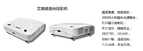 与此同时,激光投影机的出现也激发了教育投影行业的新活力,重新树立了大众对投影技术的信心,激光投影与电子白板组合而成的多媒体教学系统成为用户的新选择。在这种趋势下,深圳市艾博德科技股份有限公司与富士康集团强强联合,携手推出全新超短焦激光投影机。凭借其更好的显色性能、更高的亮度、终身没有耗材和更低的维护成本,获得了广大教育用户的青睐。“高雅气质、颜值担当”,艾博德股份超短焦激光投影机带你体验全新“视”界。