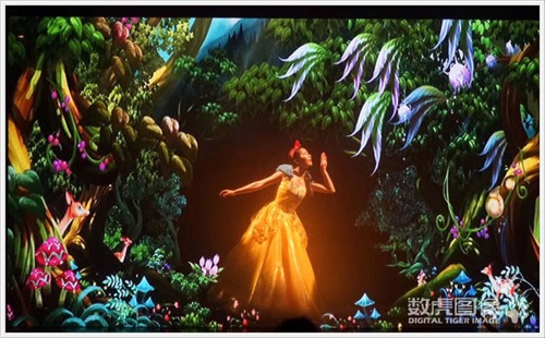 除舞台基建需求小、不受空间限制等优势,纱幕投影、裸眼3D等先进多媒体技术更是令互动秀增色不少。互动秀现场以纱幕投影呈现3D视觉影像,演员在幕前幕后表演,利用纱幕的通透感,呈现逼真立体之景,形成一种梦幻的虚拟影像。
