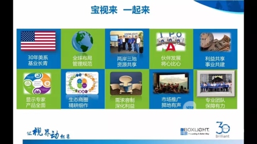 在全球其他市场,Boxlight除继续布局教育整合应用外,更着眼在地市场的多元性,围绕显示应用整体解决方案本地布局。近年来,Boxlight分别在墨西哥城、伦敦、台北、上海设立营销中心,谋求在全球市场的蓬勃发展。2016年,Boxlight在中国正式启用全新中文名宝视来,将Boxlight在中国市场引向纵深发展。Boxlight宝视来致力于整合全球资源,嫁接中国动力,凝聚伙伴力量,引领产业创新。宝视来坚持以客户需求为中心,尊重客户的多元价值需求和使用意愿,布局产业生态圈,全面响应中国市场蓬勃发展的各类商业创意和畅想,建设万众创新的显示服务应用平台。旗下开发单灯、双灯、HLD LED极光、高亮激光等多种光源、3LCD和DLP显示技术、光学规格(长焦、短焦、超短焦)等各类产品投影与显示平台多达16类,产品系列超过80 款,可为教育、商业、展览、会议工程等搭建从30寸到300寸的各类显示空间;