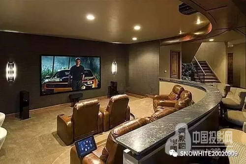 正向投影是普通家庭最常规的投影安装方式,投影幕布位于电视墙一侧,而投影机则位于沙发一侧。这种布局的好处在于观看者看电影大片时的位置和平时观看电视节目时一致,但是需要解决的最大问题是如何让银幕和电视机在电视墙前共同存在:壁挂的电视机不能挡住幕布,幕布放下后恰好又能挡住电视机屏幕,同时还不能破坏整体的家居装修风格。