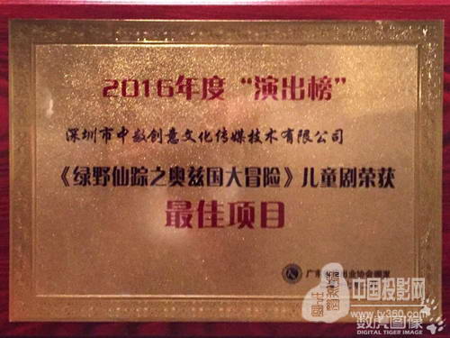 2月28日,2017中国(广州)演出经纪人年会在广州琶洲会展区保利世贸博览中心召开。本届经纪人年会属国内首届,活动现场除演艺项目展览、演艺行业信息交流、表演区展示、项目推荐、各类论坛讲座等,还公布了中国演出行业2016年度排行榜获奖名单,数虎图像旗下DT儿童剧荣获“优秀参展项目”奖项,其出品的3D亲子音乐剧《绿野仙踪之奥兹国大冒险》荣获最佳项目奖。
