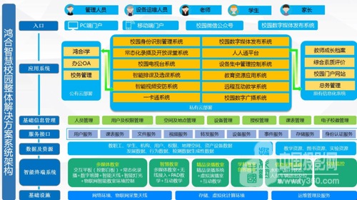 在教育领域已拥有相当口碑与市场的鸿合科技,其智慧校园内涵就非常丰富,由12部分组成的系统架构足以支撑起教学工作的方方面面。如校园身份识别管理系统、校园数字媒体发布系统、常态化录播及开放课堂系统、设备集中管理控制系统、校园电视台系统、教育资源应用系统、智能排课及选课系统、远程互动教学系统、教学评价系统、组卷及阅卷系统、智能视频安防系统、校园数字广播系统。