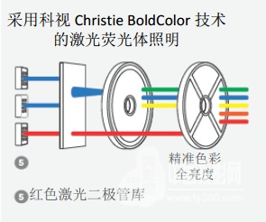 传统的激光荧光体使用蓝色激光二极管作为主要光源,蓝光射向涂有荧光体的旋转色轮并激发黄光,再通过分色涂层分离黄光,生成红光和绿光,分离后的红光、绿光和蓝光投射到DLP芯片等成像芯片,最终通过镜头投射到屏幕。科视BoldColor在激光光源、多种光学元件以及视频处理软硬件等多方面进行改进,在不依赖信号失真的前提下实现高亮度、细腻动人的画面。传统的激光荧光体的最大痛点在于红光不足,科视BoldColor技术增加了红色激光二极管,为色轮中的其他色段节省区段空间,红色和蓝色激光二极管的结合在提高色彩精确度的同时保持系统效率,得到更高的光输出和精确的色彩。