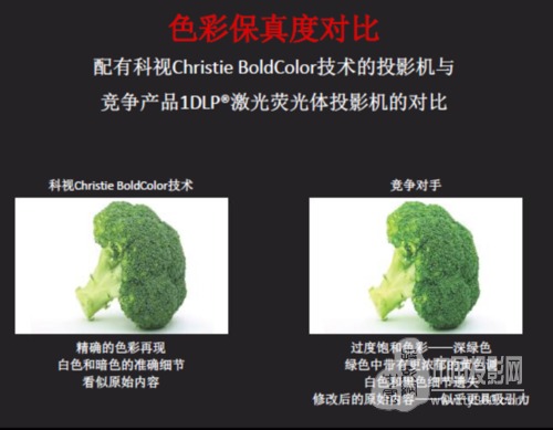 激光荧光体放映由于亮度高、寿命长、维护成本低等优势受到广泛应用,然而亮度和色彩保真度不可兼得的固有缺陷成为了限制其蓬勃发展的瓶颈。各大厂商往往选择失真和修改视频信息的方式来提高亮度,一种方式是消减黑色和白色并过度饱和色彩,导致图像看似具有冲击感,实则失去高光和低光等画面细节;另一种方法是提高黄色或绿色,但会破坏皮肤色调并留下白点。与大多数厂商的做法不同,全球视听领导者科视坚持视频内容不可修改的原则,创新的BoldColor技术利用红色激光二极管以及专利光室、专业保护软件,将画面按创作时一样精确显示,在高亮度下依然绚丽而真实,符合Rec. 709标准高清色彩。