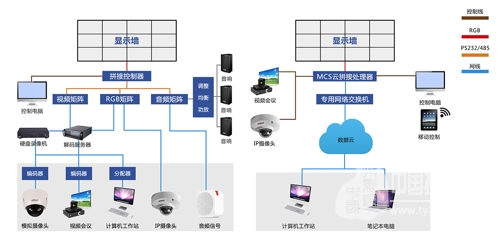 项目中的显示系统分为两个部分:展示运用、监控运用。两套显示屏分别位于不同位置,若是采用硬拼架构或者分布式架构,,对于线缆来说都比较繁杂,而长线传输会导致信号衰减。MCS云拼接则避免了这个问题,同时还有它方面的特点优于传统架构。
