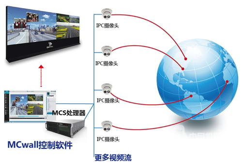 最高可接入9999路IPC流信号;可支持主流标准协议及私有协议的IPC流信号直接显示,非常适用于安防监控。MCwall管理软件可设置多画面同时显示,满足安防中多点多地的监控需求。