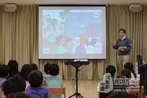 开始投影后,孩子们的视线会马上紧紧注视着屏幕,会被佐藤先生讲的故事深深吸引。原本视频带有英语字幕以及声音,佐藤先生把视频调成静音,只使用画面的播放形式,佐藤先生的讲解配合着生动画面的投影,达到了即使是幼童也能很好理解故事内容的效果。