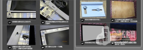 5、将弹簧与幕布的孔位对齐,用拉钩将弹簧水平拉伸并钩住幕布的洞孔,拉平幕面。(注:弹簧需要跟幕布的孔位与边框内槽保持90度垂直)