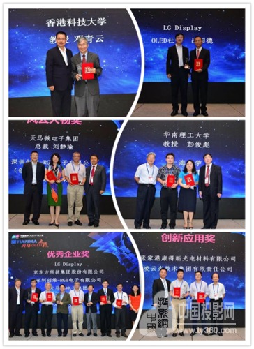 其中“OLED发明人”邓青云教授荣获“终身成就奖”、LG Display OLED事业部社长吕相德荣获“领军人物奖”;天马微电子集团总裁刘静瑜、创维集团RGB总裁刘棠枝荣获“风云人物奖”;华南理工大学教授彭俊彪、上海大学教授张建华荣获“杰出贡献奖”;天马微电子集团、京东方、LG Display、创维集团、AP SYSTEMS、昆山国显光电荣获“优秀企业奖”;张家港康得新光电材料有限公司、凌云光技术集团有限责任公司荣获“创新应用奖”。