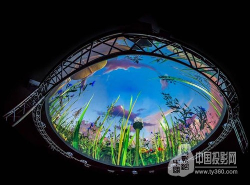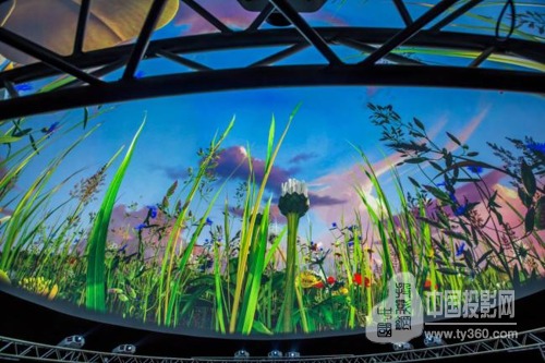 在球幕影院的苍穹之下,是由12台爱普生CB-G7400U工程投影机 打造出的360度大视角投影画面:夕阳西下,一缕缕斜阳洒在花朵绿叶的枝头,一帧帧美妙的画卷惊艳绽放,让大家身临其境的感知球幕的精彩世界。