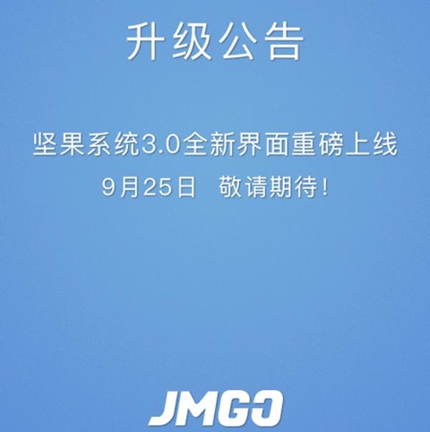 2、本次升级包括S1、S1pro、G1、G1pro、G1S、P2、X1等机型,升级时间为9月25日00:00(已经升级为坚果OS 3.0或以上版本的用户,将不会再收到升级提醒)。