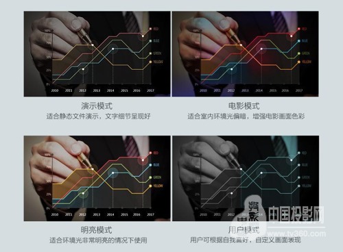 更贴心的是,有鉴于现代会议过程中视频播放次数的不断增加,明基E560还特别提供了电影模式,16:10宽屏,让视频展示更赏心悦目,兼顾令人满意的清晰度;而对于一些有特殊需求的用户,E560也贴心准备了用户模式,用户可以根据自我喜好,自由调节画面表现,大大提升用户在使用试过程中的满足感。