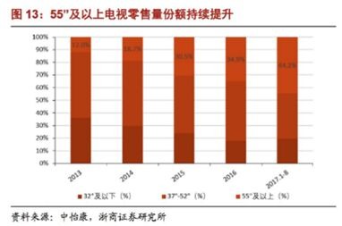 据中怡康数据显示,2017年传统彩电市场大屏化趋势明显。2017年Q2,60寸及以上销量113.4万台,占彩电总销量11.3%,同比增长52%。2017年1-8月间55寸及以上的份额提高至44.2%,较2016年提升近10个点,但70寸及以上只占5%。由于液晶屏幕的制作工艺,70寸以上的4K电视价格呈指数级别上升(100寸电视20-50万元),使得有需求的消费者只能望而却步。