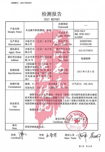 国家新闻出版广电总局电影技术质量检测所检测报告是经我国电影行业唯一的国家级检测机构——中国合格评定国家认可委员会(CNAS)认可的检测报告。经权威检测认证的样机名称、生产单位、检测类别、检测项目、检测日期、检测结果以及测试相关人员签字等数据在报告中缺一不可。