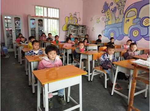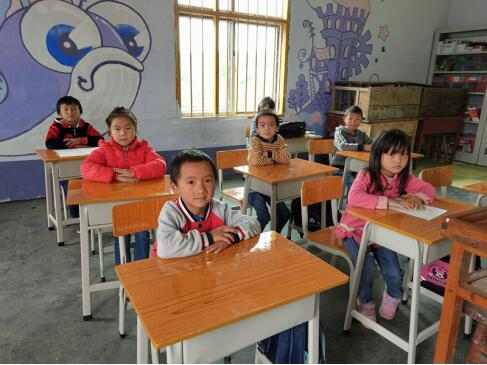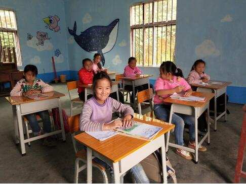 在焕然一新的教室里用上崭新的桌椅,孩子们的脸上露出了开心的笑容。