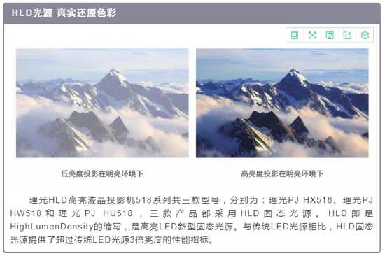 采用了HLD LED光源的理光518系列产品,其中理光PJ HX518可投射5200流明亮度、理光PJ HW518和理光PJ HU518最大输出亮度可达5000流明,拥有2,500,000:1的高对比度,光源寿命高达20,000小时,因此在投影机使用生命周期内免除了用户更换光源的问题,节省了大量成本。