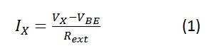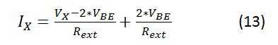 Q1晶体管的基极连接至程控电压源。发射极经由一个串联电阻器RS连接至另一个正电轨,并且集电极接地。这样便可以在晶体管的发射极形成一个VX + VBE电压。Q2晶体管的发射极通过电阻器RX连接至Q1的发射极。RX设置导入FB节点的电流。基极接地后,Q2发射极节点产生一个+VBE。等式5计算了流至发射极的电流(理想情况):