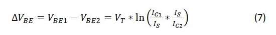 如果两个晶体管的集电极电流差异较大,则VBE不会完全彼此抵消。等式7阐述了晶体管两个VBE之间的差异: