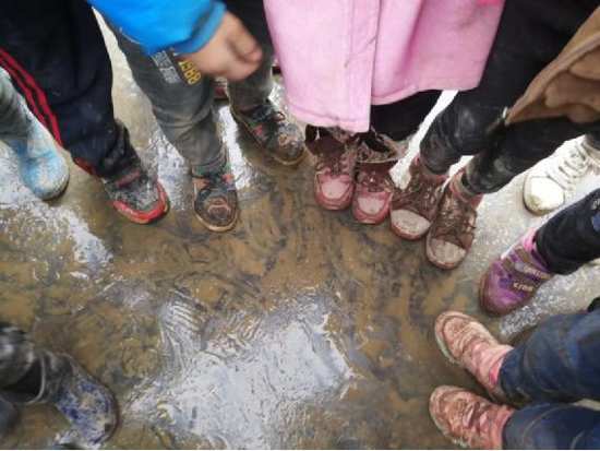 好多孩子穿的要么是笨重宽大不透气的雨鞋,要么是满是泥水、湿透了的帆布鞋或球鞋,这一湿就是一整天。有几个男孩脚上穿着姐姐留下的粉红鞋,却很满足地说很喜欢。问孩子们冷吗?他们腼腆地笑着摇头,却告诉我们他很喜欢学校,这儿比家里吃得好,玩得开心。看着这样一群质朴的孩子,心里一阵酸楚。
