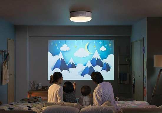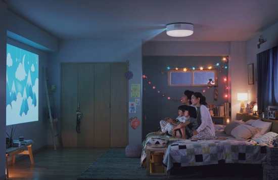除了Z6,极米科技与百度在日本子公司 popln 出品了一款名为 popln Aladdin 的智能投影吸顶灯,也同样获得了日本Good Design Award设计奖。这款吸顶灯结合了投影和 harman/kardon音响系统,采用日本统一的吸顶灯接口,安装极其方便,不多占用家里一分空间,很好地与居家生活融为一体。