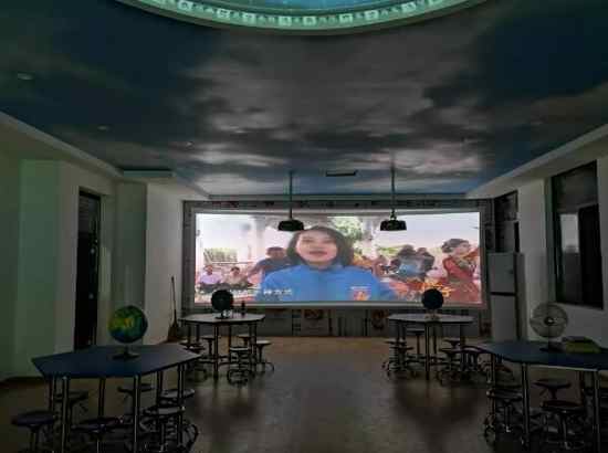 授课方式不一样 在羿飞地理专用教室,教师通常运用教室后方的巨大投影屏幕即环幕示教系统和天花板上的天文演示穹顶播放课程相关视频,开启整堂课。并在课程中穿插使用,帮助学生加深理解。位于教室前端的数字立体地形,解决了地理老师上课频繁更换各类地图甚至需手绘地图的问题。它将三维地形模型和虚拟数字影像融合,并可以在立体模型上进行动态演示,如冷暖锋相遇在江南地区形成梅雨的过程等,打破传统地理单一的模型教学效果。
