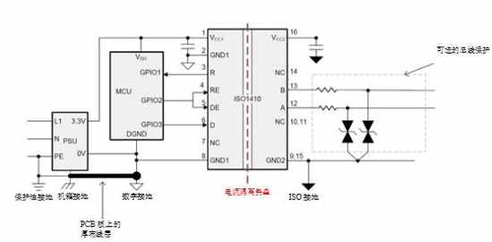 隔离型RS-485设备采用何种瞬态保护取决于最终系统中可能的干扰类型,例如静电释放(ESD)、电快速瞬变脉冲群(EFT)或浪涌,以及所需的保护水平。TI隔离型RS-485收发器产品系列如果具有浮动绝缘接地导体,则集成收发器总线终端会具有某种程度的内部瞬态保护。除此之外,正确设计系统后,您可以利用隔离势垒形成针对这些瞬态变化的高阻抗。如果您不希望系统中出现差分瞬态现象,并测试了所有与最终设备接地相关的瞬态,然后将保护性接地装置(PE)连接到隔离型收发器的逻辑侧,将使所有高电压瞬态发生在隔离势垒处。把PE连接到逻辑侧,可以免除外部组件,如瞬态电压抑制(TVS)二极管或防脉冲电阻等。