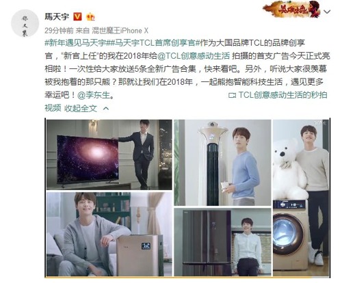 “作为大国品牌TCL的品牌创享官,‘新官上任’的我在2018年给@TCL创意感动生活 拍摄的首支广告今天正式亮相啦!听说大家很羡慕被我抱着的那只熊?那就让我们在2018年,一起熊抱智能科技生活,遇见更多幸运吧!”