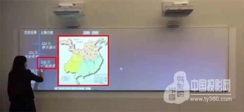 教师通过由CB-710Ui打造的“宜动宜静”双屏展示,不仅避免了换行、展示不全等情况,将历史的时间轴完整的“一屏展示”,并确保学生可以清楚的看到;还可以通过上述的展示形式,把发展的时间、事件、地理、人物等紧密串联起来,让学生更加清晰地了解到历史发展的脉络。