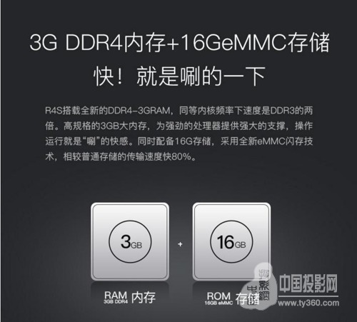 酷乐视R4S延续了酷乐视产品的超高配置,物理分辨率1080P的同时亮度高达880ANSI流明。采用Mstar最新64位MSTAR核智能系统和Mali3D GPU的视频处理器,支持3D/4K,搭载3GB的DDR4RAM行业顶尖配置,在同等内核频率下速度是DDR3的两倍, 16GeMMC的存储相比同类4G、8G的存储性能更强,另外,还配置了美国AR音响、支持上下左右四向梯形校正、1.2投射比、光学调焦、自动聚焦、无线同屏以及HDMI、USB等常用接口。