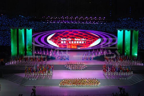 除了春晚,2010年的世博会开幕式上也使用了当时较为先进的舞台背景全彩LED显示屏。该块LED显示屏由上海三思制造,显示面积达500㎡,总像素达1300万,采用了多画面实时同步播放控制、实时无缝切换数据环路、逐点亮度色度一致性校正和低亮度下无灰度损失等控制技术,使得高科技与原生态在舞台上获得了完美的交融。恢弘大气的屏幕配以优美多变的舞姿,让开幕式焕发朝气蓬勃的崭新面貌,显示出中国文化自信的另一面:包容、接纳、欢乐、分享。