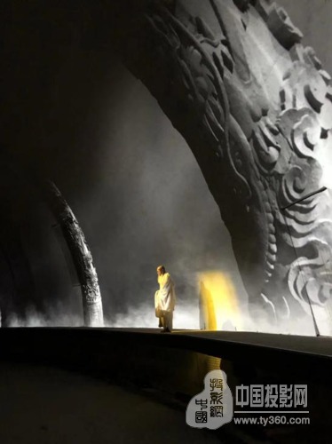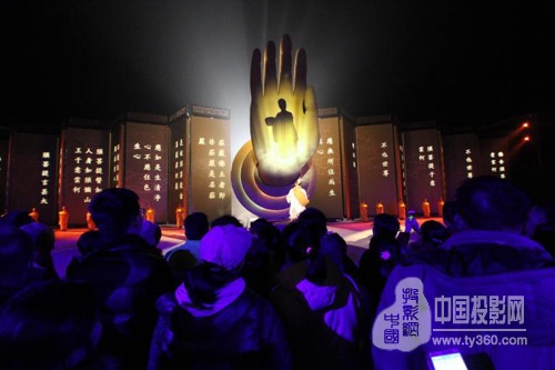 时空隧道的尽头是一排宽45米的巨大屏风。为了将经文画面完整投映出来,同时又可以达到渲染氛围的效果,赢康配合每扇屏风的不同角度设计了投影画面,经过细致的融合处理,投影画面变得效果十足,十分精彩。在投影机的安装方式上,采用赢康设计的户外安装方式,使投影画面更加灵活流畅。随后,屏风打开,高达9米的巨型佛手徐徐推出,金色的投影画面立即投射在佛手上,六祖慧能的故事正式开始。