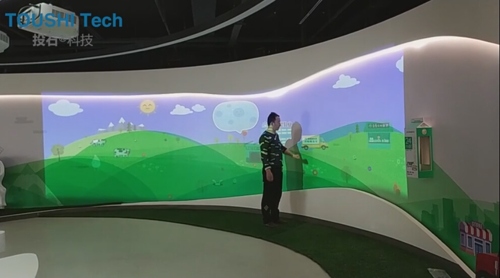 南京投石科技在为北京新希望乳业展厅做触摸互动墙时就采用了两通道弧形投影墙面。此项目中的触摸互动墙设有10个触摸感应点,所有传感单元都隐藏在触控介质内部,保证表面装饰材料的完整度。