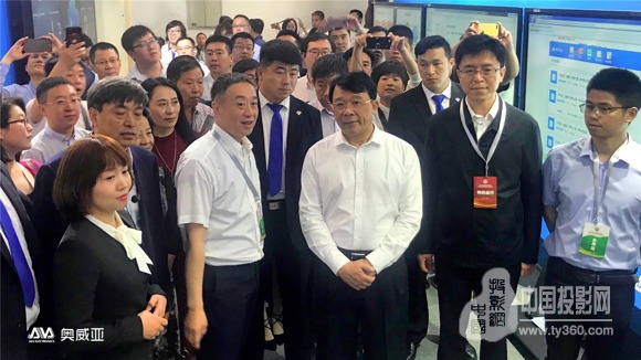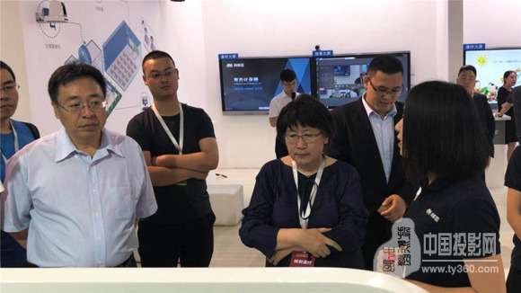 图十一:湖南省教育厅副厅长应若平(图右二),湖南省教育厅基教处处长杨玲(图右一) 参观奥威亚与中国电信安徽教育信息化项目互动展示区