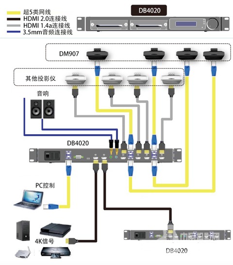DB4020全自动融合平台使用HDBaseT接口,拓展连接均使用超五类网线,可解决机房与投影现场过远而出现的无法调试问题、信号远距离传输问题。双向传递的指令信息、摄像头录像信息以及信号源视频信息被集中于网线中传输,系统连接极致简化,布线更简单。